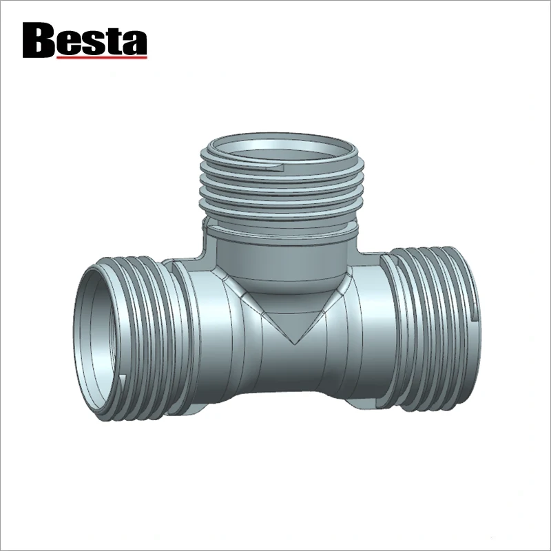 PP compression fittings are widely used in agricultural irrigation, garden irrigation, desert irrigation, etc. fittings material is PP, connect PE pipe, so also called PE fittings, PE compression fittings. About this tee mold, we use LKM or other brand standard mold base, cavity use 718H or H13 steel, with water cooling system, cold runner, side gate for big size, subgate for small size, tee mold with 2 cavity, automatic, product design with PN16 or PN10 , two different pressure can design, nut can design according to sample or our own design.